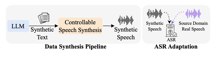 We propose a data synthesis pipeline using LLMs and controllable speech synthesis to adapt ASR models to new domains without any target-domain data, achieving 28% relative WER improvement.