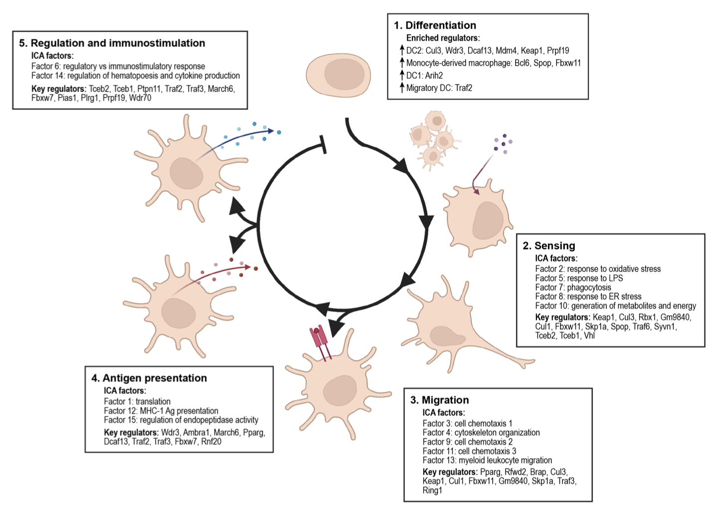 E3 ligases regulate key processes, but many of their roles remain unknown. Using Perturb-seq, we interrogated the function of 1,130 E3 ligases, partners and substrates in the inflammatory response in primary dendritic cells (DCs). Dozens impacted the balance of DC1, DC2, migratory DC and macrophage states and a gradient of DC maturation. Family members grouped into co-functional modules that were enriched for physical interactions and impacted specific programs through substrate transcription factors. E3s and their adaptors co-regulated the same processes, but partnered with different substrate recognition adaptors to impact distinct aspects of the DC life cycle. Genetic interactions were more prevalent within than between modules, and a deep learning model, comβVAE, predicts the outcome of new combinations by leveraging modularity. The E3 regulatory network was associated with heritable variation and aberrant gene expression in immune cells in human inflammatory diseases. Our study provides a general approach to dissect gene function.
